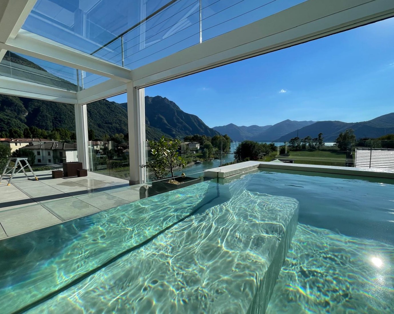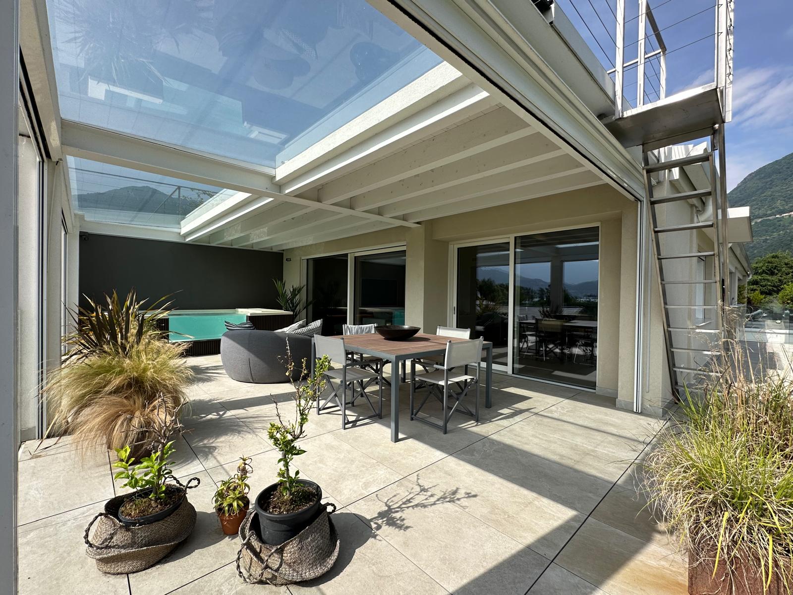 All’esterno, una grande terrazza panoramica amplia il living con zona relax e mini piscina, ideale per godere della vista dall’alba al tramonto. Dal livello superiore, una seconda terrazza con pavimento in vetro crea prospettive insolite, collegando i due piani e regalando giochi di luce unici.