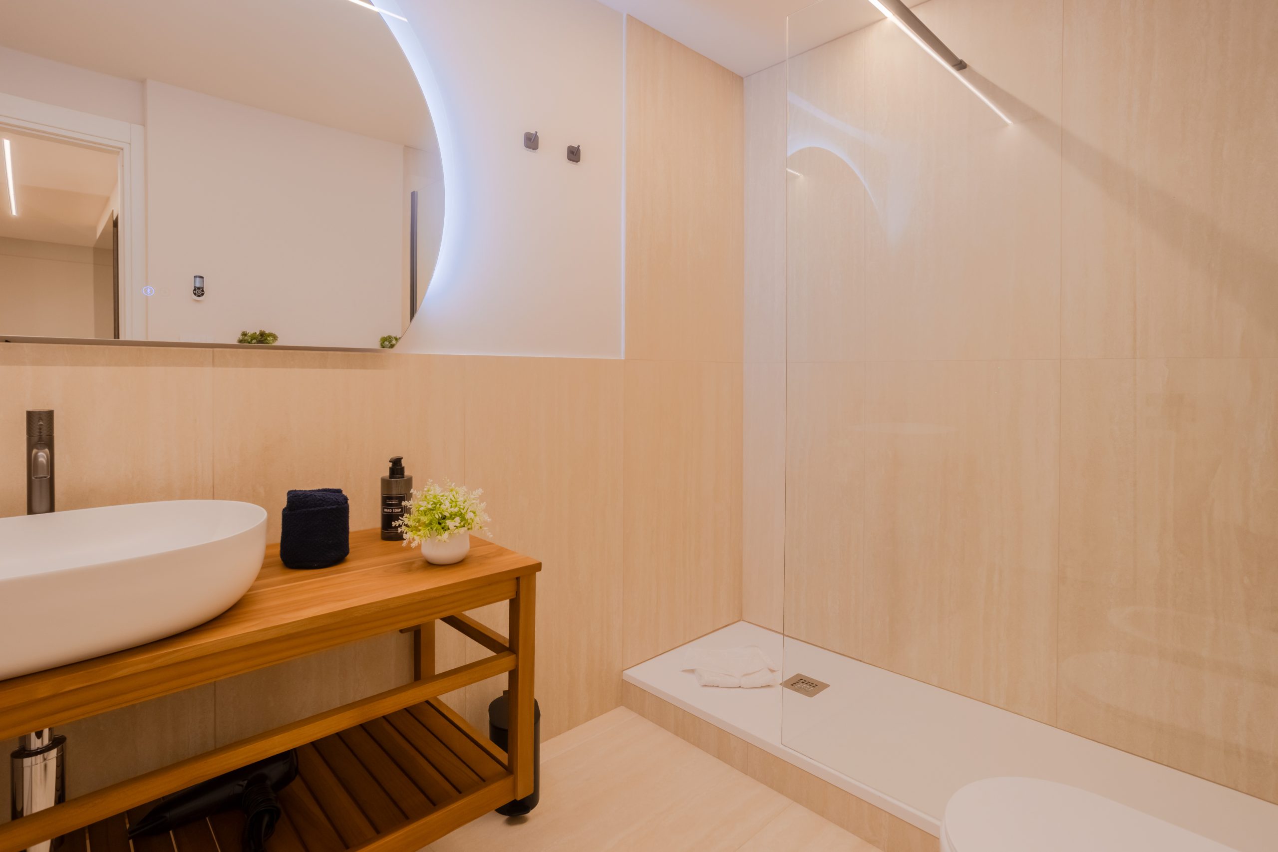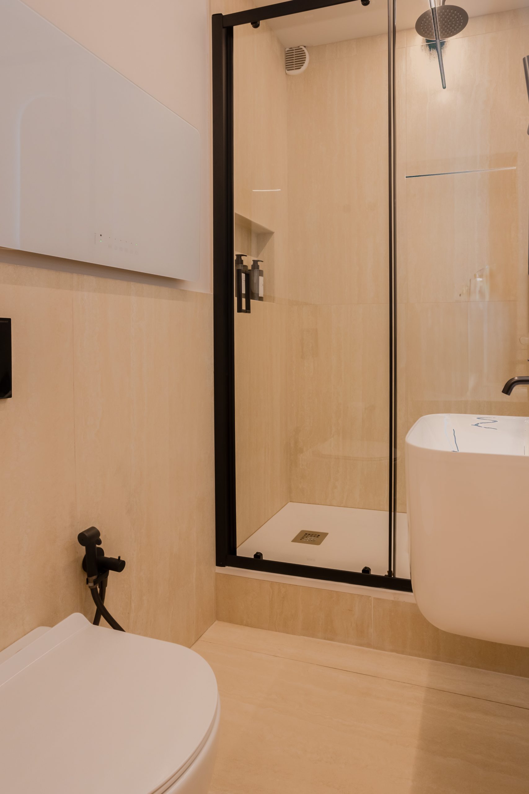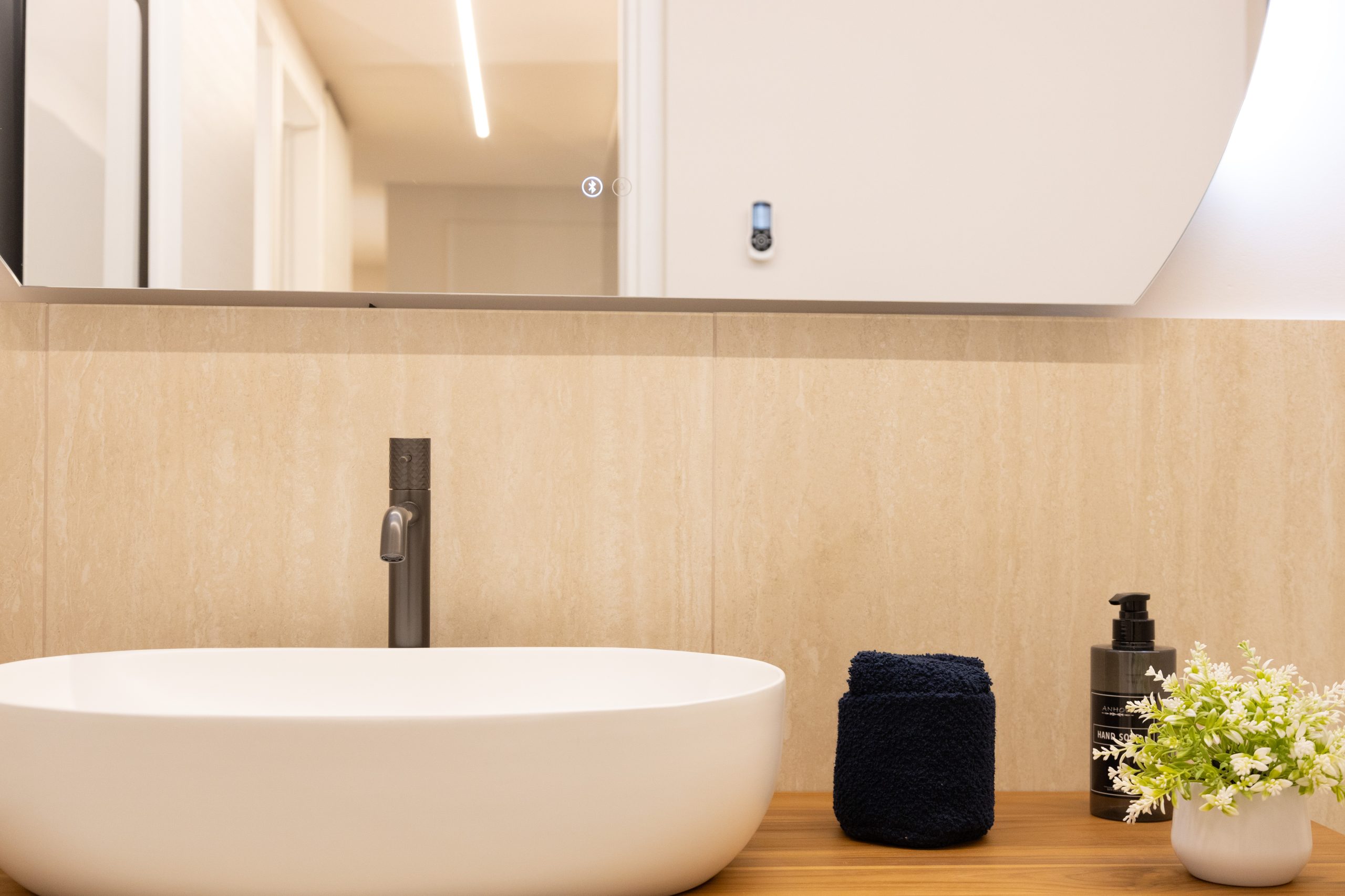I bagni, completamente rivestiti in travertino, sono luminosi ed essenziali, con specchi ampi, termoarredi in vetro e arredi pensati per offrire comfort e coerenza estetica.