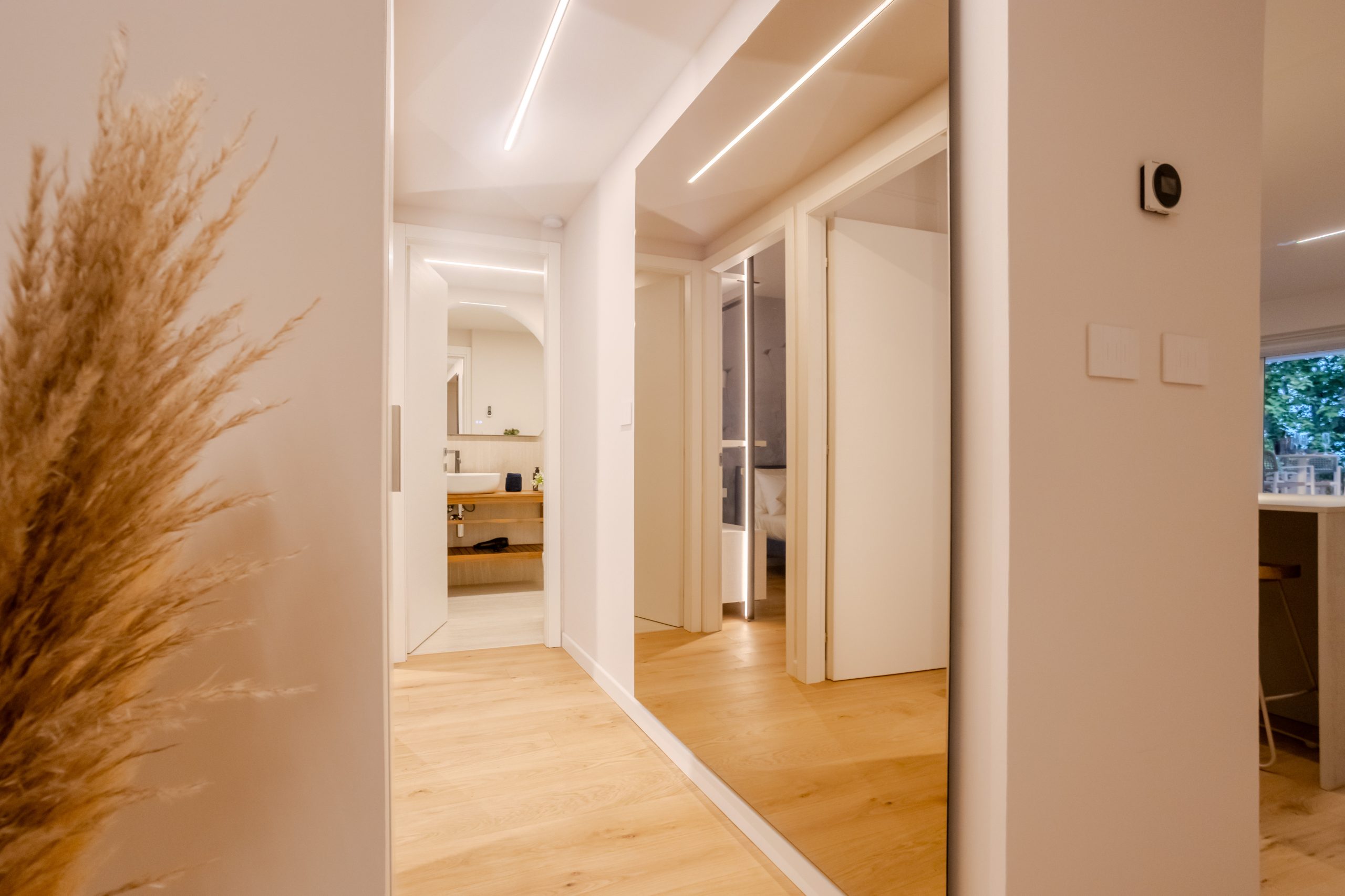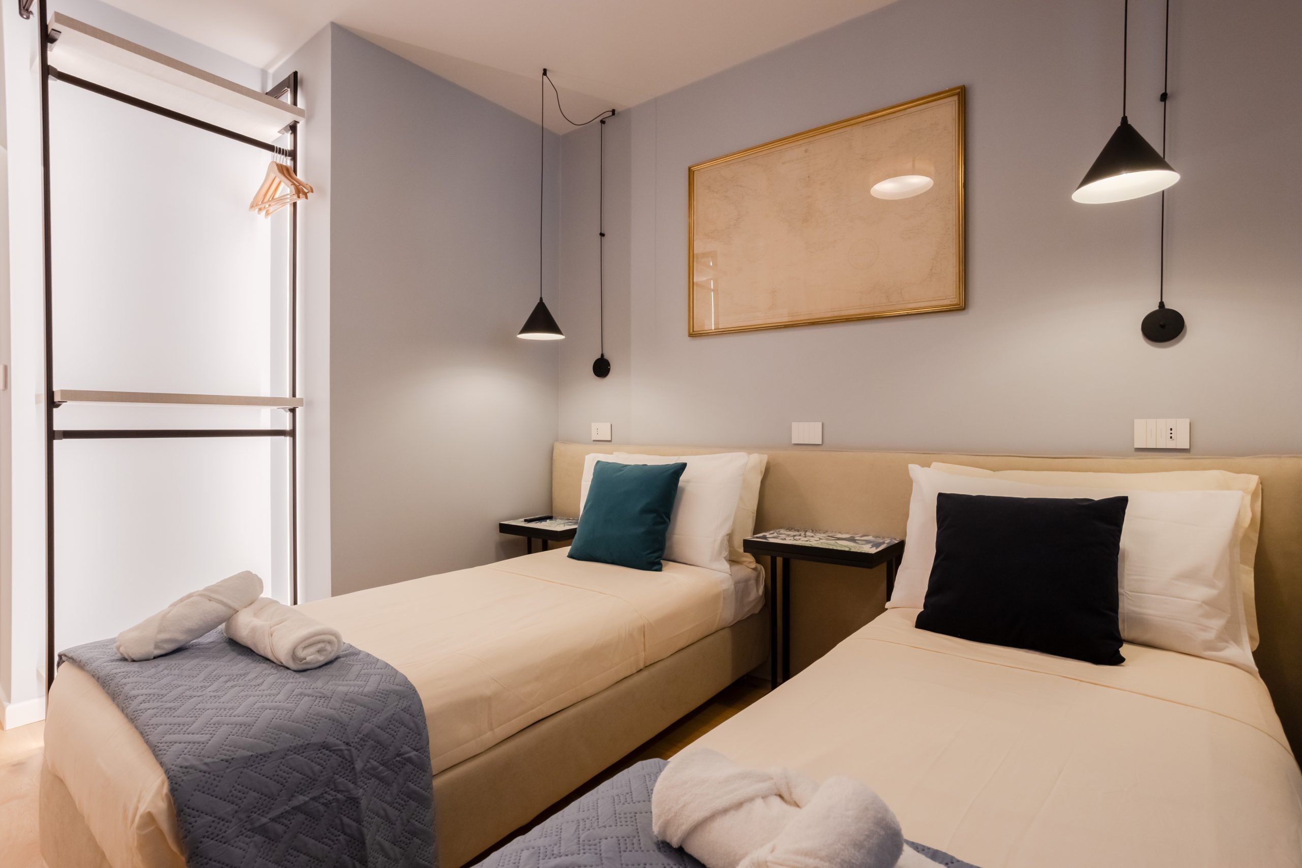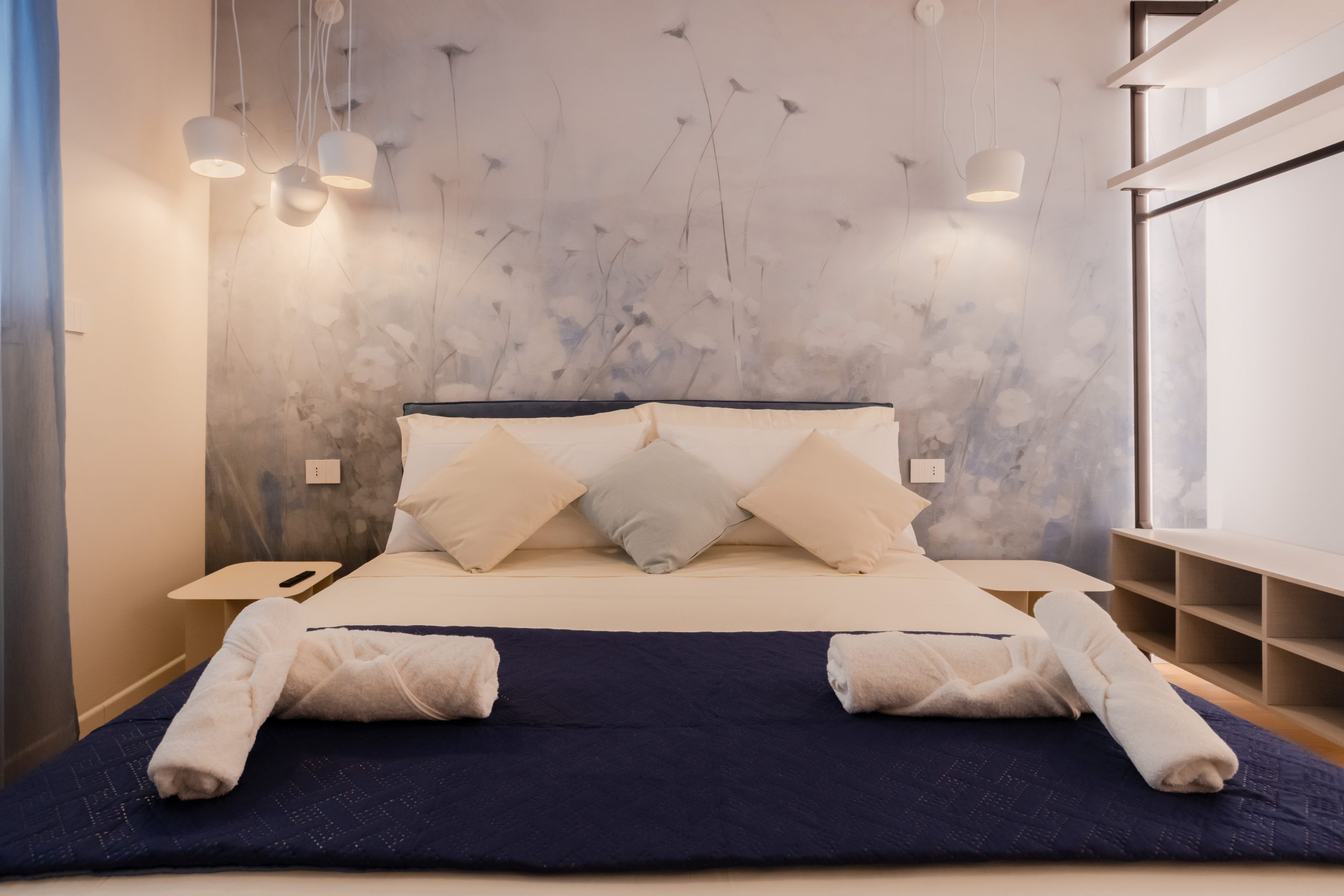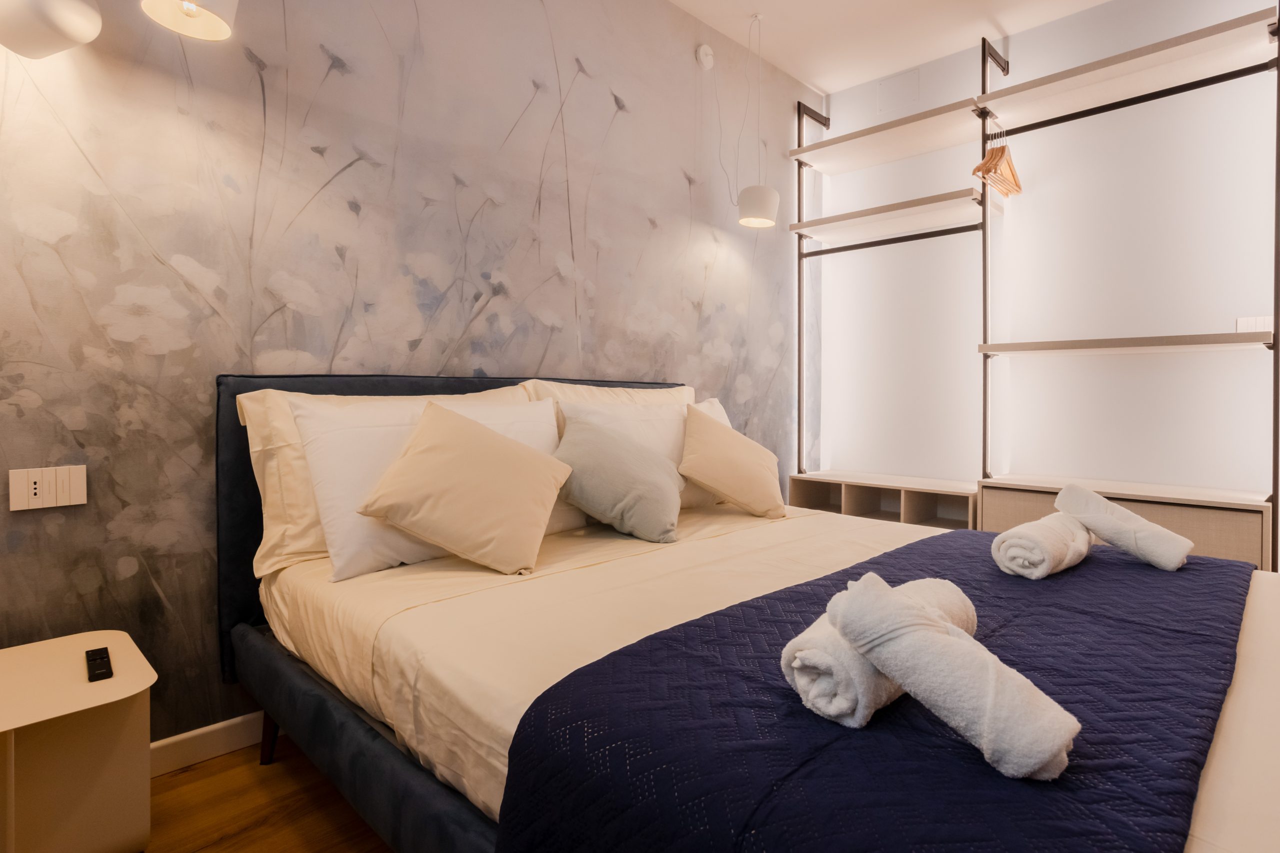 Le camere da letto mantengono lo stesso tono accogliente e raffinato. Prevalgono i toni del blu, con boiserie leggere, cabine armadio aperte e illuminate, luci a sospensione e comodini ricercati. Nella matrimoniale, una carta da parati floreale sui toni del blu racconta un’eleganza pacata; nell’altra stanza, una mappa nautica antica disegnata a mano pre eistente nell’appartamento fa da ponte affettivo con il passato.