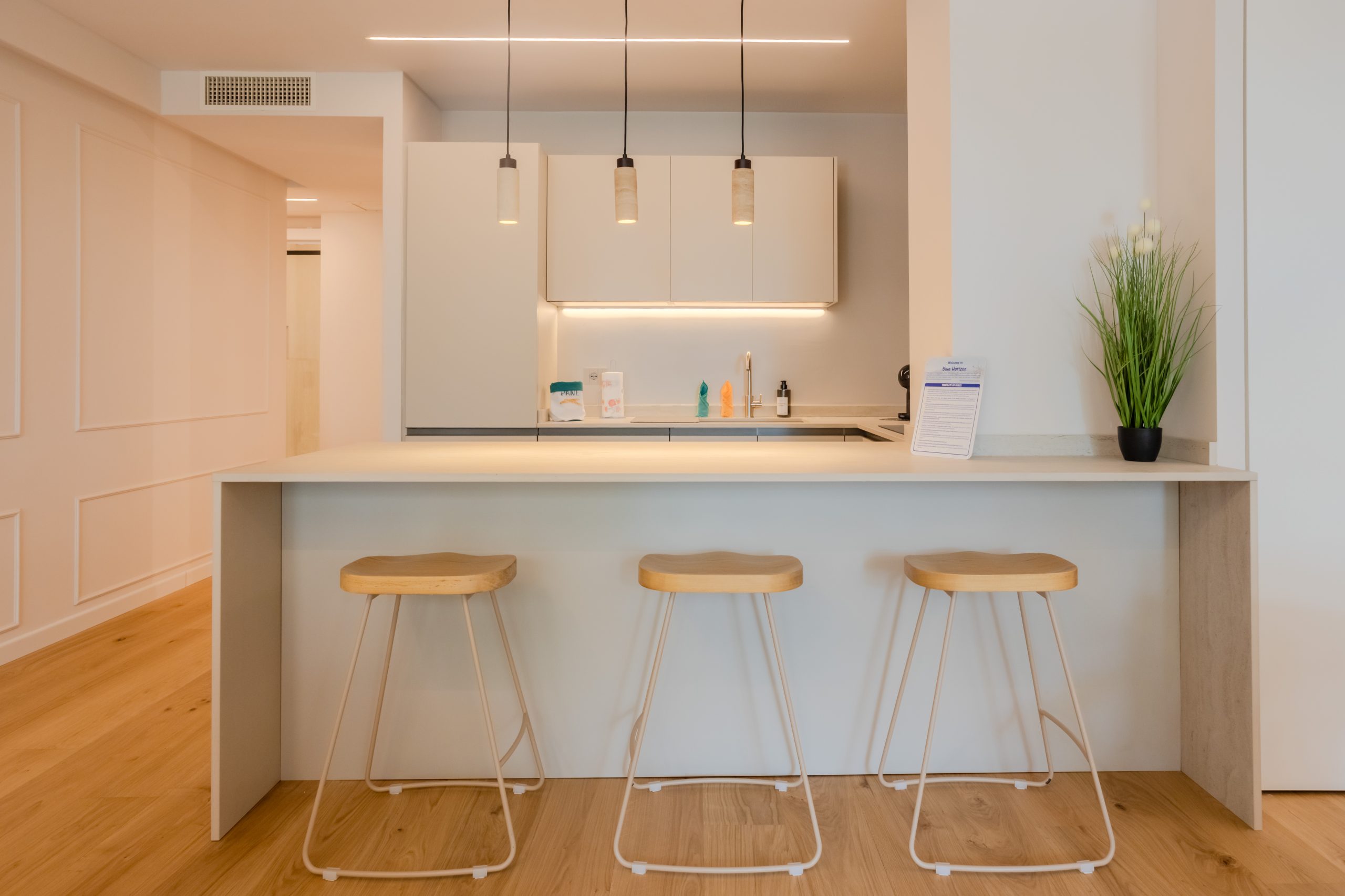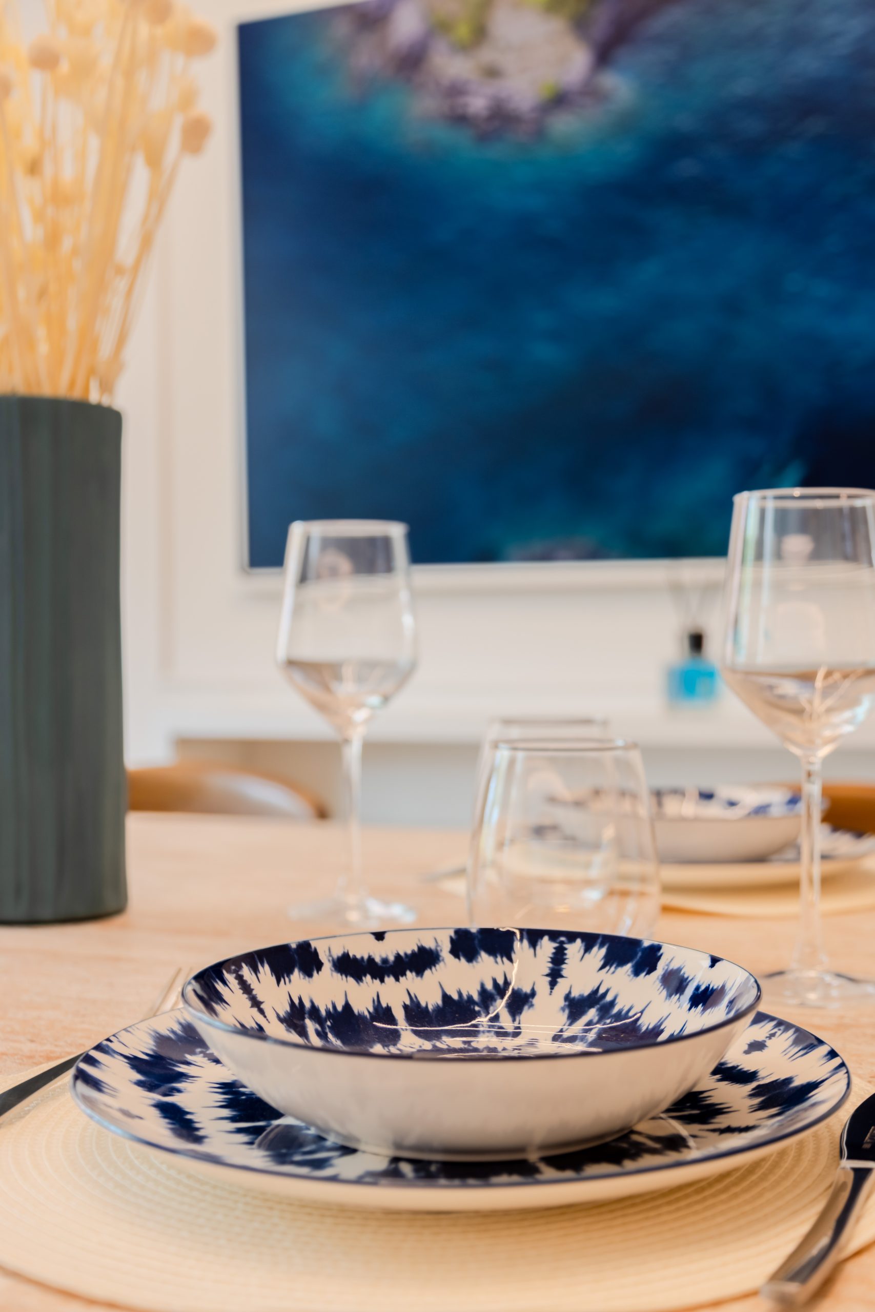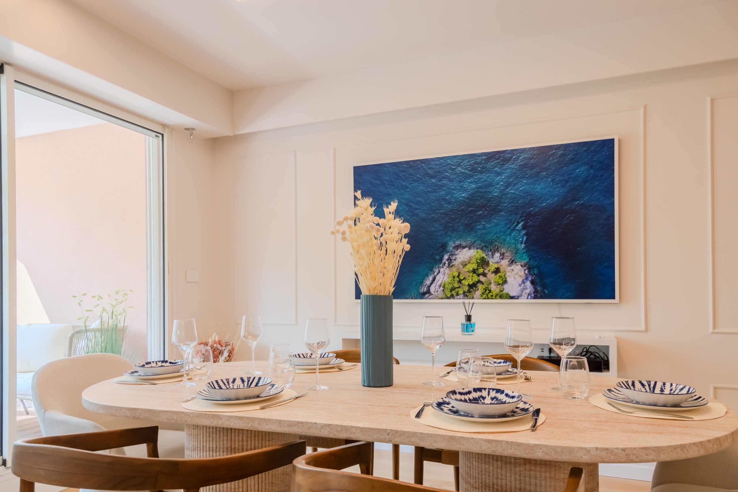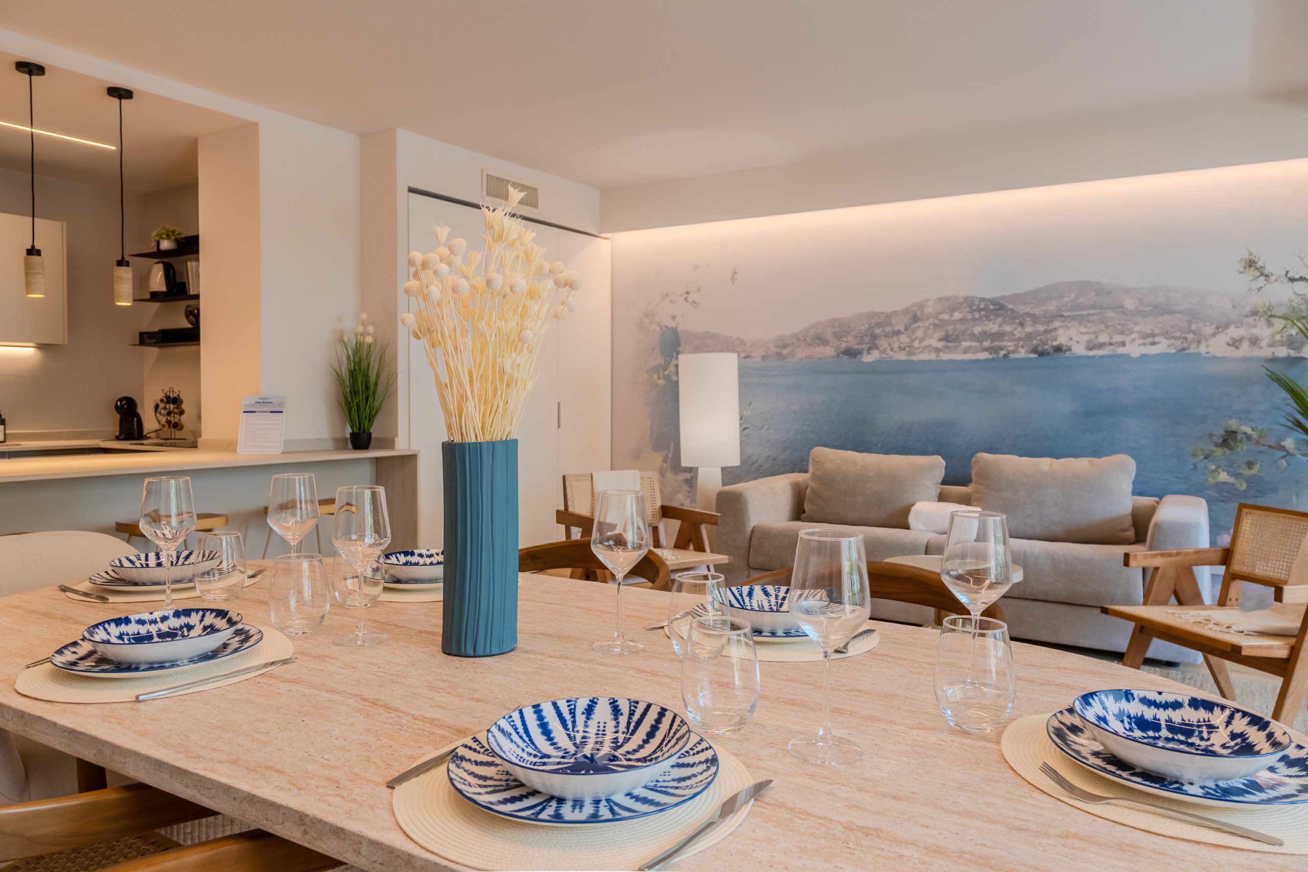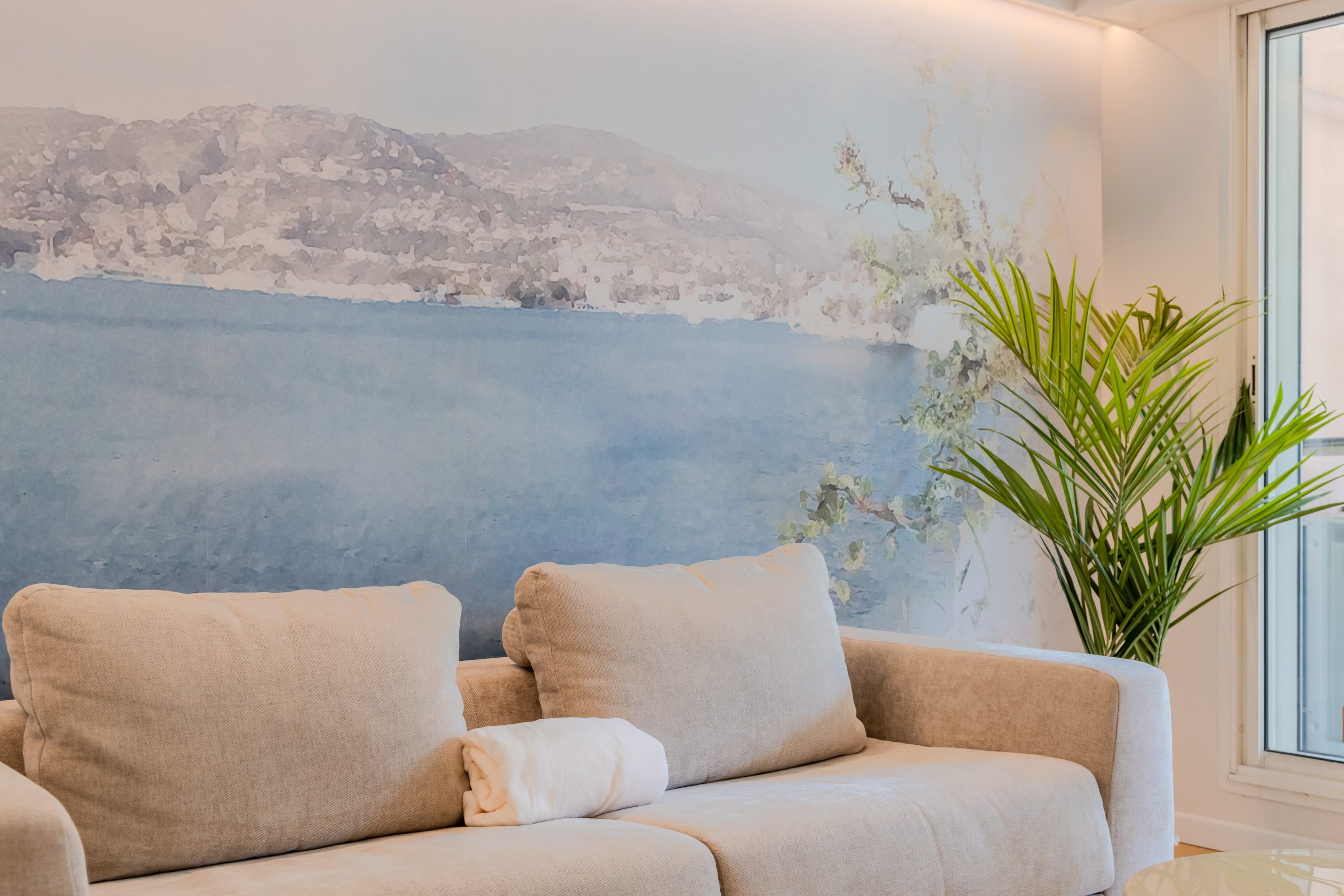 Il cuore della casa è l’open space, dove la cucina su misura si apre sulla zona pranzo e sul soggiorno. Il pavimento in legno accompagna lo sguardo fino alle ampie vetrate, che si affacciano sull’orizzonte naturale di Villefranche, regalando una vista mozzafiato. La luce entra generosa e scalda ogni ambiente. Le poltrone girevoli, in tessuti naturali, si muovono liberamente tra tavolo e zona divano, adattandosi a momenti conviviali o di relax. Le luci in travertino, le sedute in legno e una carta da parati d’artista, che raffigura un paesaggio acquerellato della costa francese, completano uno spazio fluido e sofisticato.
