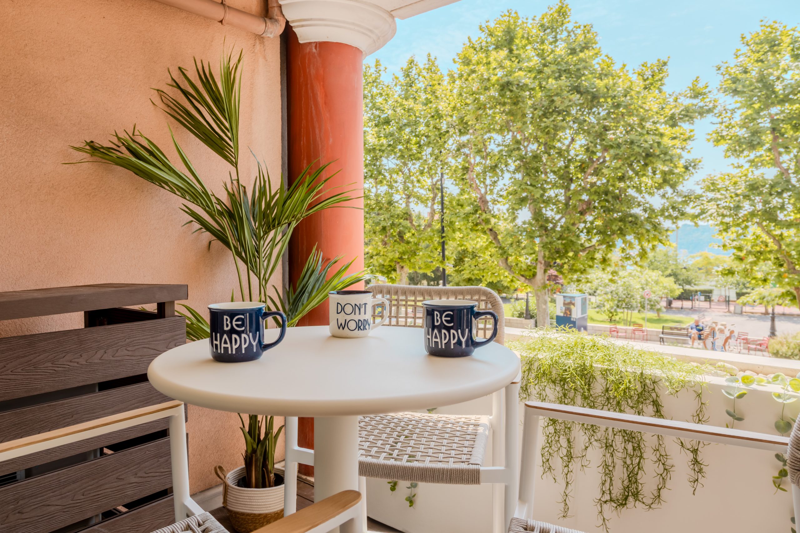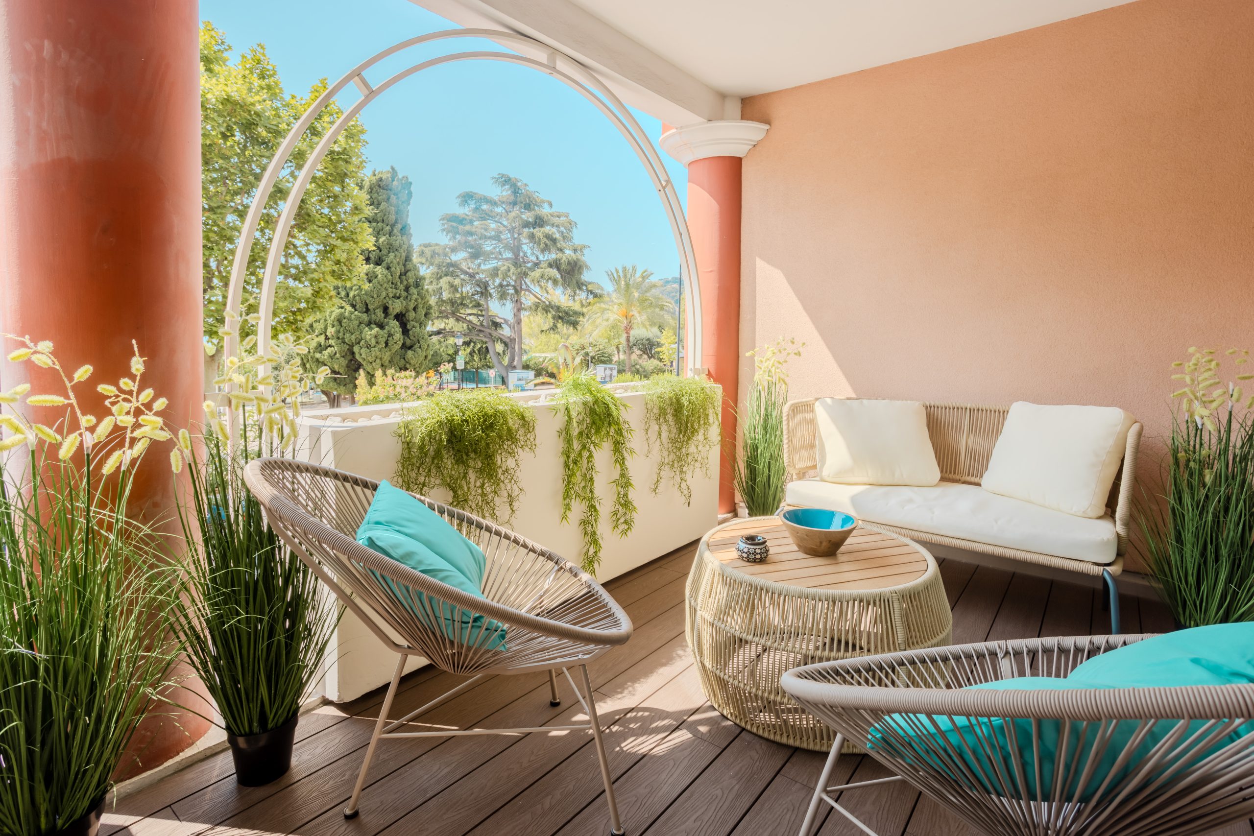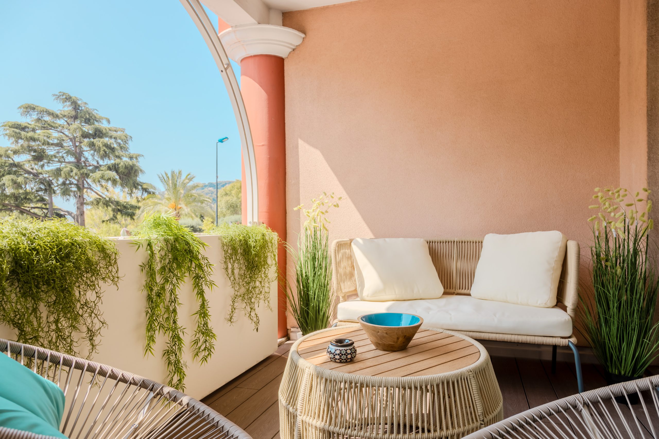 All’esterno, il terrazzo è un piccolo paradiso sospeso. Il pavimento, dalle doghe lineari che ricordano quelle delle imbarcazioni, si fonde con la natura circostante e accoglie una vera oasi privata: divanetto, poltrone, tavolini, sgabelli e piante creano un angolo da sogno, dove il confine tra interno ed esterno si dissolve. Un luogo dove il tempo rallenta, e sembra quasi di essere fuori dal mondo.